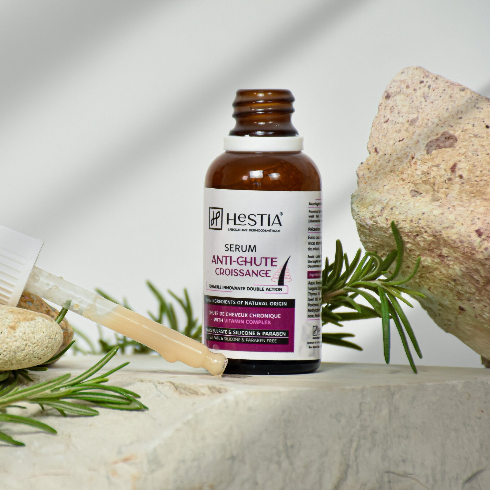 Le sérum anti-chute HESTIA, riche en ingrédients naturels actifs, aide à réduire la perte de cheveux tout en stimulant leur croissance naturelle. Sa formule enrichie en extraits végétaux fortifiants agit directement sur le cuir chevelu pour renforcer les racines, activer les follicules et améliorer la densité des cheveux.